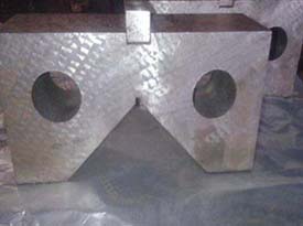 V型架主要用來(lái)安放軸,套筒,圓盤(pán)等圓形工件,以便找中心線(xiàn)與劃出中心線(xiàn)。一般V型架都是一副兩塊,兩塊的平面與V型槽都是在一次安裝中磨出的。